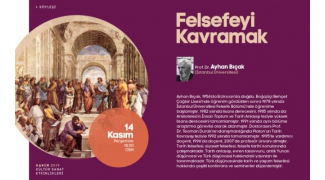 Büyükşehir Kasım Kültür Sanat Etkinlikleri ‘Felsefeyi Kavramak’ konulu söyleşi ile devam edecek. 14 Kasım Perşembe günü OSM’de gerçekleştirilecek etkinlik saat 18.00’da başlayacak.