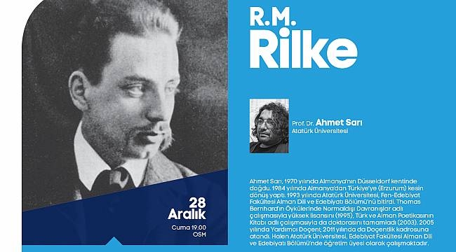 Sakarya Büyükşehir Belediyesi Aralık Kültür Sanat Etkinlikleri, 28 Aralık Cuma günü gerçekleştirilecek ‘R. M. Rilke’ konferansı ile devam edecek. Prof. Dr. Ahmet Sarı’nın konuşmacı olarak katılacağı konferans 28 Aralık Cuma günü saat 19.00’da Ofis Sanat Merkezi’nde gerçekleşecek. Kültür ve Sosyal İşler Dairesi Başkanlığı’ndan yapılan açıklamada, “R. M. Rilke’ isimli konferans etkinliğimize tüm kültür sanat dostları davetlidir” denildi.