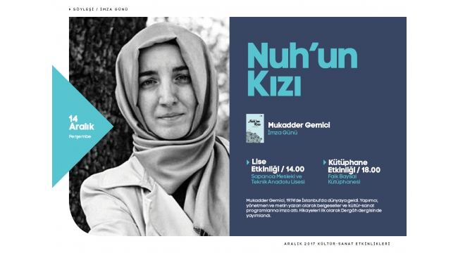 Sakarya Büyükşehir Belediyesi Aralık Kültür Sanat Etkinlikleri, 14 Aralık Perşembe günü gerçekleştirilecek iki programla devam edecek. Günün ilk etkinliğinde Yazar Mukadder Gemici’nin Nuh’un Kızı kitabının söyleşisi ve imza günü gerçekleştirilecek. İlk olarak saat 14.00’da Sapanca Mesleki ve Teknik Anadolu Lisesi öğrencileri ile bir araya gelecek olan Yazar Mukadder Gemici, saat 18.00’da Faik Baysal Kütüphanesi’nde sevenleri ile buluşacak. Özel gösterimlerde sıra ‘Neruda’daGünün ikinci etkinliği ise dünya sinemasından seçme film gösterimi ile devam edecek. Ofis Sanat Merkezi’nde gerçekleştirilecek olan programda yönetmenliğini Pablo Larrain’in üstlendiği ‘Neruda’ filmi Sakaryalı sinemaseverlerin beğenisine sunulacak. Özel gösterim saat 20.00’da başlayacak ve ücretsiz gösterim için rezervasyonlar [email protected] adresinden yapılabilecek.