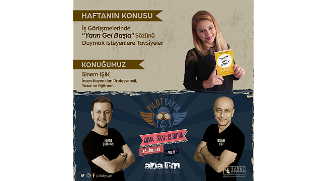 İletişim Uzmanı Hakan ÇETİNBAŞ, bu haftaki konuğu İnsan Kaynakları Profesyoneli ve Yazar Sinem IŞIK ile kariyer planlama, cv hazırlama incelikleri, iş mülakatlarındaki sorulan sorulardaki incelikler ve yeni işe başlayanlara tavsiyeler kapsamında bir radyo söyleşisi gerçekleştirecek. Toplumun birçok kesimini yakından ilgilendiren konu başlıklarının konuşulacağı Pilot Yayın, bu akşam saat 19.00’da 90.0 frekanslı Ada FM’den ve www.adafm.net adresli web sitesinden canlı yayınlanacaktır.