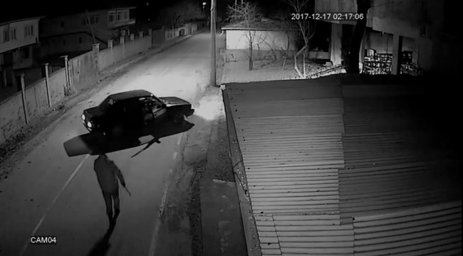 Görüntülerde, otomobil ile markete gelen şüphelilerin, levye ile kapıyı açmaya çalışmaları ve 4 hırsızdan 3’ünün içeriye girerek sigara raflarını boşalttığı diğer şüphelinin ise market önünde elinde silahı ile çevreyi kolaçan ettiği görülüyor. Marketten çıkan otomobillerin uzaklaştıkları ve tekrar unuttukları levyeyi almak üzere soydukları markete geldikleri görülüyor.