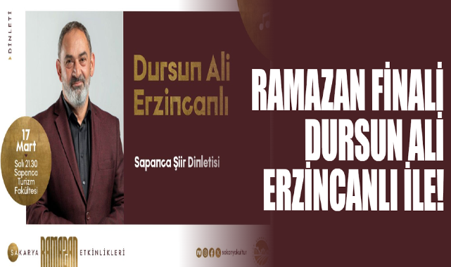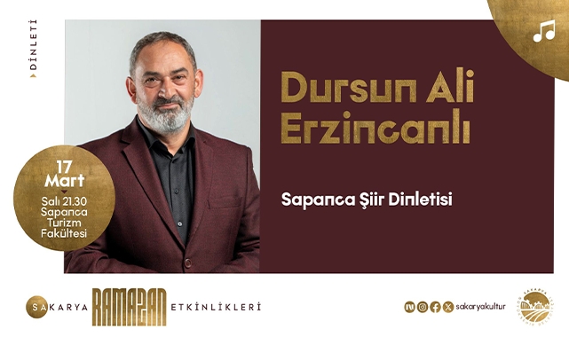 Büyükşehir Ramazan Kültür Sanat Takvimi, Dursun Ali Erzincanlı’nın konuk olacağı şiir dinletisiyle devam edecek. 17 Mart Salı günü Sapanca Turizm Fakültesi’nde gerçekleşecek program saat 21.30’da başlayacak.