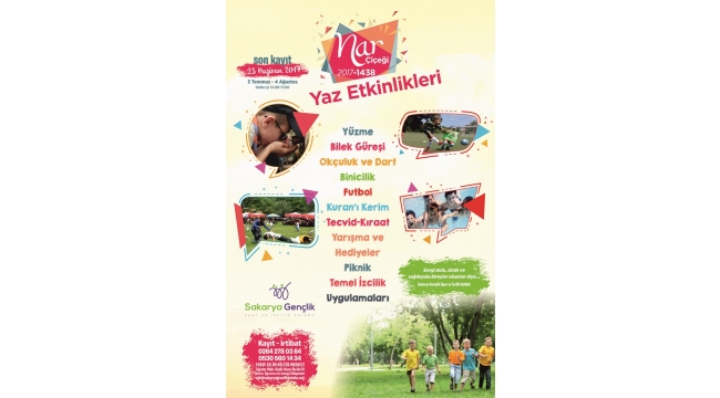 Kur’an-ı Kerim ve Tecvid-Kıraat eğitimleri ile birlikte yüzme, bilek güreşi, okçuluk, dart, binicilik, futbol, piknik, temel izcilik uygulamaları gibi etkinliklerinde bulunduğu program 3 Temmuz - 4 Ağustos tarihleri arasında Merkez ve Camili olmak üzere iki bölgede yapılacak. 7-14 yaş arası çocuklara hitap eden hafta içi her gün 13.00-17.00 saatleri arasında yapılacak olan faaliyet toplamda 5 hafta sürecek. Kontenjan ile sınırlı olan etkinliklere bilgi kayıt için: 0264 278 0364-0530 560 1434 numaralı telefonlardan ulaşabilirsiniz.