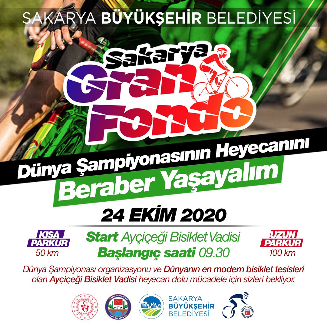 23-25 Ekim tarihleri arasında gerçekleştirilecek Dağ Bisikleti Maraton Dünya Şampiyonası etkinlikleri Gran Fondo Sakarya yarışları ile başlayacak. 24 Ekim Cumartesi günü Ayçiçeği Bisiklet Vadisi’nden başlayacak yarışlar tüm bisiklet tutkunlarına açık olacak. Gran Fondo Sakarya bisiklet yarışlarına katılmak isteyenler http://www.sakarya2020.org/tr-TR/Sayfalar/SayfaDetay/84 detaylı bilgilere ulaşabilecek, kayıt yaptırabilecek.
