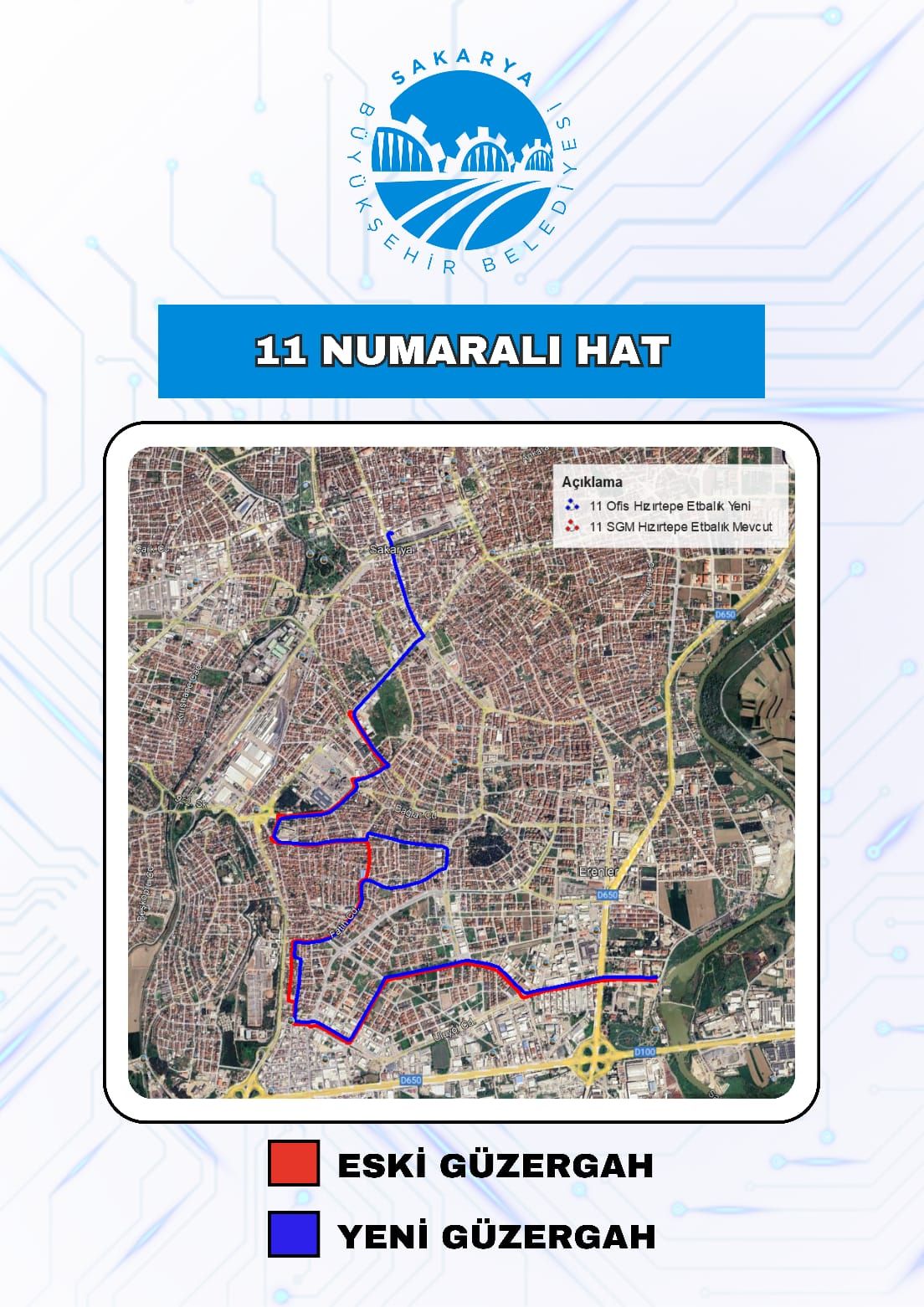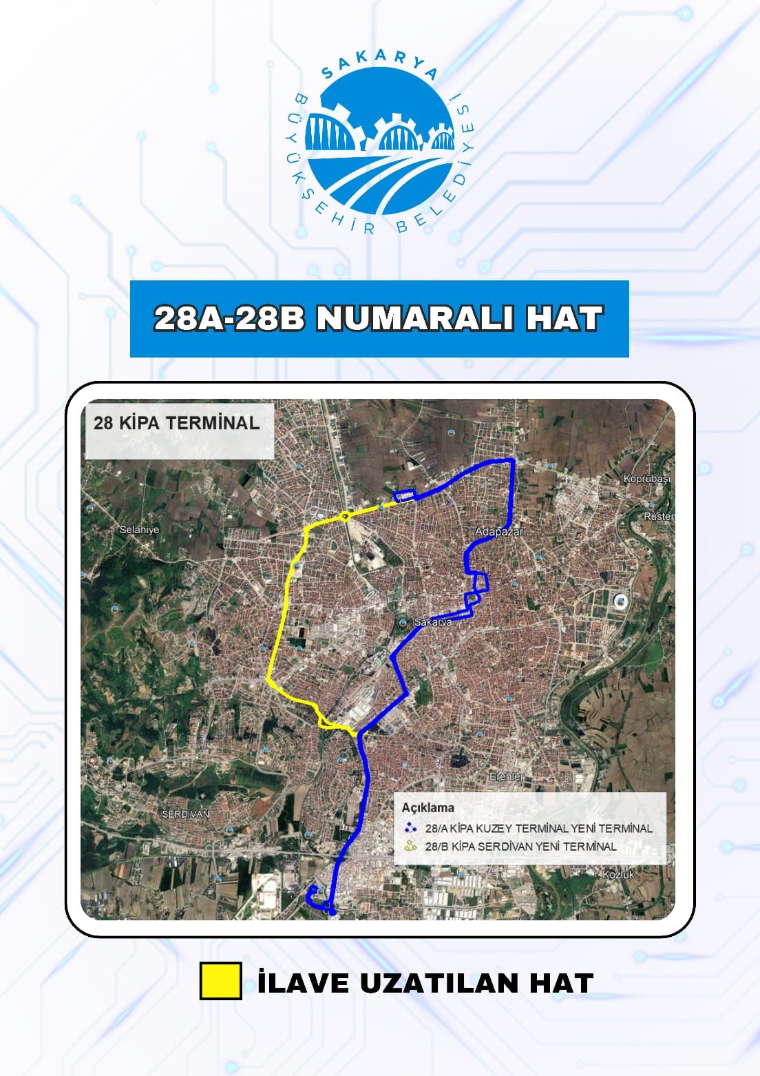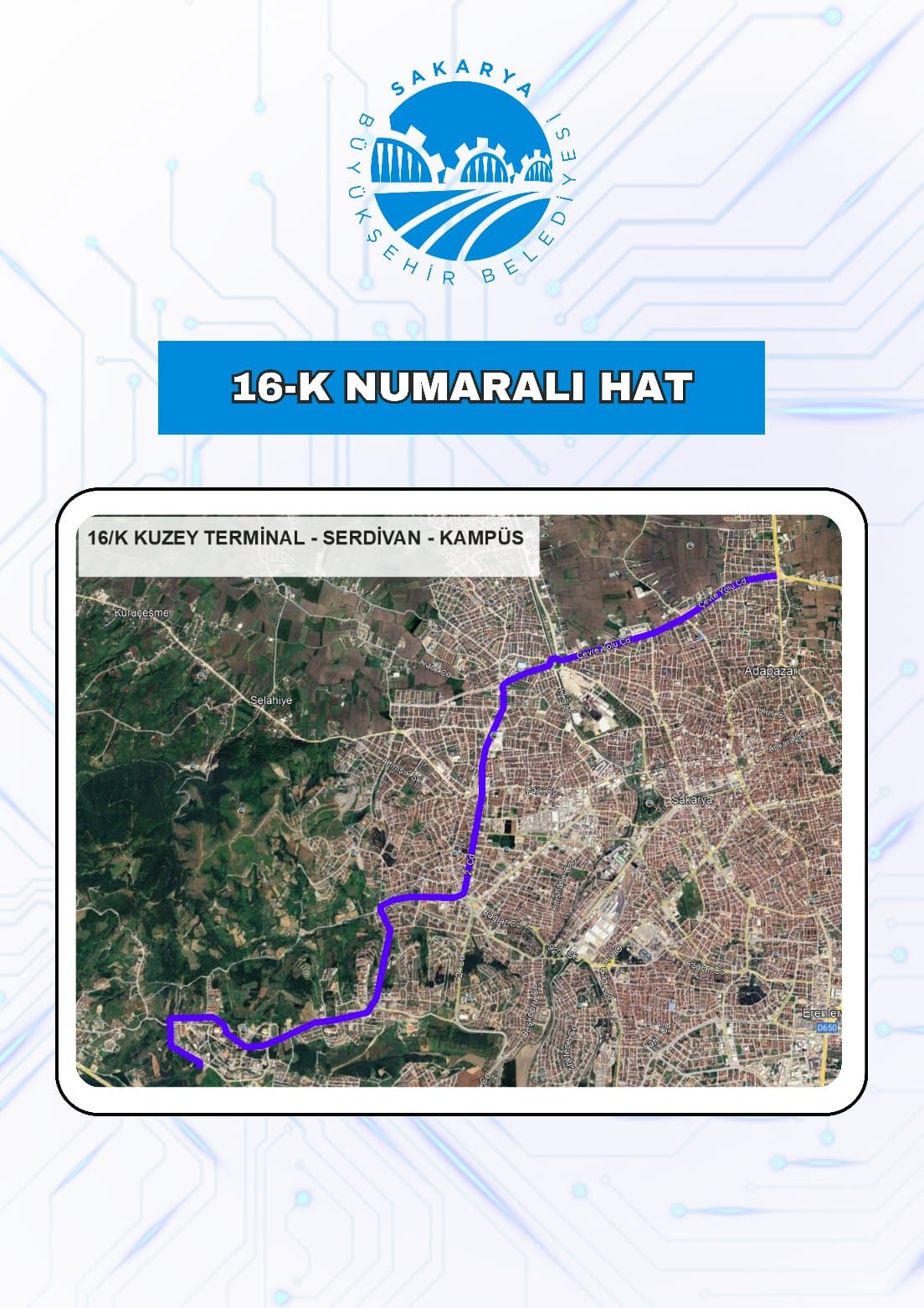 Büyükşehir Belediyesi, toplu taşıma hatlarına yeni hat daha eklerken bazı hatlarda değişikliğe gitti. Kuzey Terminal-Serdivan-Kampüs güzergahında çalışacak 16-K numaralı hat devreye alınırken 11 ve 28 numaralı hatlarda ise değişikliğe gidildi. Yeni düzenlemelerle hatlar seferlerine 4 Eylül Perşembe gününden itibaren hizmet vermeye başlayacak.