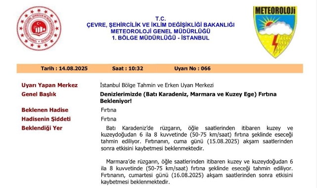 Meteoroloji Genel Müdürlüğü 1. Bölge Müdürlüğü, İstanbul Bölge Tahmin ve Erken Uyarı Merkezi’nden yapılan açıklamaya göre, Batı Karadeniz’de, Sakarya kıyıları dahil, bugün öğle saatlerinden itibaren kuzey ve kuzeydoğudan saatte 50-75 km hızla kuvvetli fırtına bekleniyor.