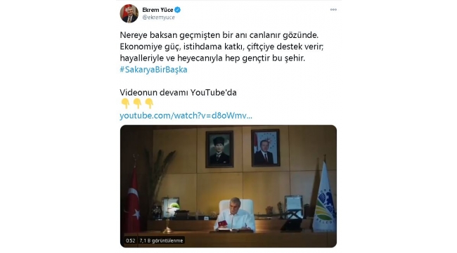 Sakarya Büyükşehir Belediyesi şehrin doğal güzelliklerini ve tarihini tanıtmak amacıyla sosyal medya kampanyası düzenledi. ‘#SakaryaBirBaşka’ etiketi ile gerçekleştirilen kampanyada birçok sosyal medya kullanıcısı paylaşımda bulunarak Türkiye gündemine girildi. Büyükşehir Belediye Başkanı Ekrem Yüce’nin de katıldığı kampanyada Başkan Yüce kendi resmi sosyal medya hesabından, “Nereye baksan geçmişten bir anı canlanır gözünde. Ekonomiye güç, istihdama katkı, çiftçiye destek verir; hayalleriyle ve heyecanıyla hep gençtir bu şehir” diyerek paylaştığı video ise kısa sürede çok sayıda paylaşım aldı.