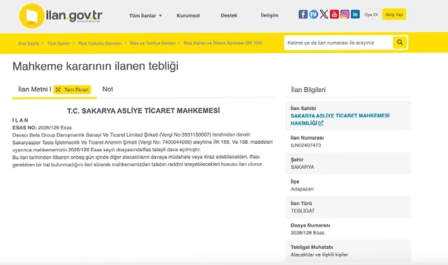 Söz konusu davanın detayları, Basın İlan Kurumu (BİK) tarafından kamuoyuna duyuruldu. Sakarya Asliye Ticaret Mahkemesi'nde açılan dava kapsamında, İcra ve İflas Kanunu'nun ilgili maddeleri uyarınca yasal süreç başlatıldı.Davanın Temelindeİddialara göre bu davanın temelinde, 2024/2025 sezonunda kulübün kullanımı için alınan araç kiralama hizmeti bulunuyor. Şirketin, yaklaşık 550 bin TL tutarındaki alacağını tahsil edemediği gerekçesiyle yasal yollara başvurduğu ve kulübün iflasını istediği belirtiliyor. 15 Gün SüreYayınlanan ilana göre, Sakaryaspor’dan alacağı olan diğer kişilerin veya şirketlerin bu davaya müdahil olma hakkı bulunuyor. Alacaklılar, bu ilanın yayınlandığı tarihten itibaren 15 gün içinde mahkemeye başvurarak iflası gerektiren bir durum olmadığını savunup davanın reddini talep edebilecekler.