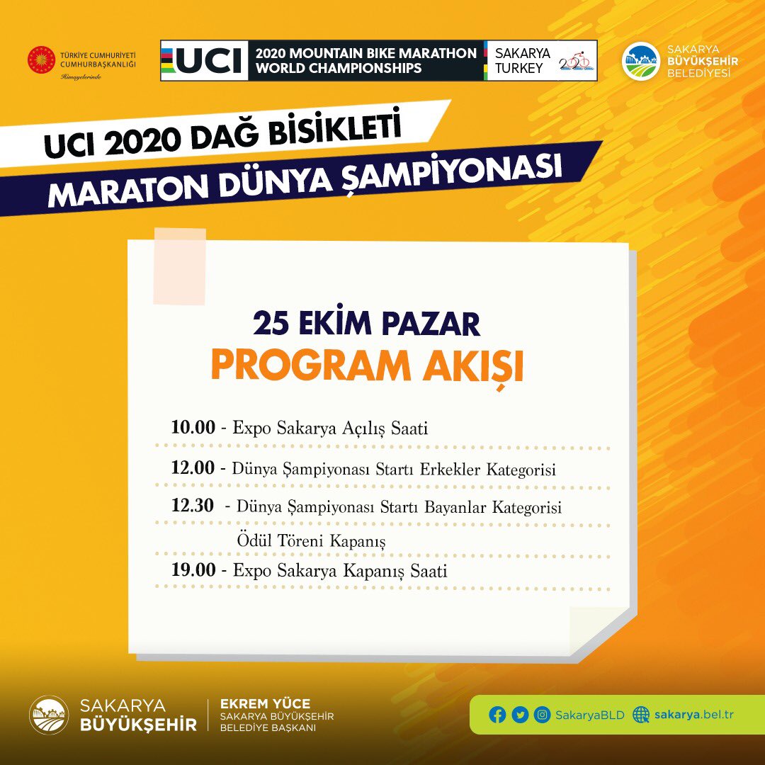 2020 Dünya Dağ Bisikleti Maraton Şampiyonası’ndaki dev yarışlar 25 Ekim Pazar günü başlayacak. Başkan Ekrem Yüce, “Erkeklerde saat 12.00’da ve kadınlarda 12.30’da başlayacak dünya şampiyonası yarışları nefes kesecek. Tüm vatandaşlarımızı heyecanın zirve noktasına ulaşacağı dünya şampiyonası yarışları için Ayçiçeği Bisiklet Vadisi’ne bekliyoruz” dedi.