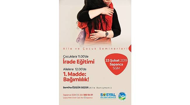 Sakarya Büyükşehir Belediyesi Sosyal Hizmetler Dairesi Başkanlığı Aile Danışma Şube Müdürlüğü tarafından düzenlenen Aile ve Çocuk Seminerleri devam ediyor. 23 Şubat Cumartesi günü Sapanca SGM’de düzenlenecek olan ‘Madde Bağımlılığı ve İrade Eğitimi’ konulu seminere sgm Aile Danışmanı Semiha Özgür Sezer konuşmacı olarak katılacak. Seminerlerde ailelere ‘Madde Bağımlılığı’ eğitimi verilirken öğrencilere ise ‘İrade Eğitimi’ sunulacak. Her ayın son haftasıAile ve Çocuk Seminerleri hakkında açıklamalarda bulunan Aile ve Çocuk Hizmetleri Şube Müdürü Murat Kıroğlu, “Ailenin çocuğua doğru yaklaşımı gerek çocuğun doğru yetişmesinde, gerekse birçok toplumsal sorunun çözümünde önemli role sahiptir. Aile ve Çocuk seminerleri ile aileye ihtiyacı olan konularda doğru bilgileri sunmayı, bilinçli ebeveynleri topluma kazandırmayı amaçlamaktayız. Seminerlerimiz her ayın son haftası, farklı konularda, tüm ilçe SGM’lerde yapılmaktadır” dedi. Madde BağımlılığıKıroğlu, “Şubat ayının seminer konusu günümüzün en önemli sorunlarından biri olan Madde Bağımlılığı. Sapanca SGM’de düzenlenecek seminerde ailelere ‘Madde Bağımlılığı’ eğitimi verilirken öğrencilere ise ‘İrade Eğitimi’ olarak sunulacak. 23 Şubat Çarşamba Günü öğrencilere saat 11.00’da ve ailelere 12.00’da gerçekleştirilecek olan eğitimimize tüm öğrencilerimiz ve velilerimiz davetlidir” dedi.