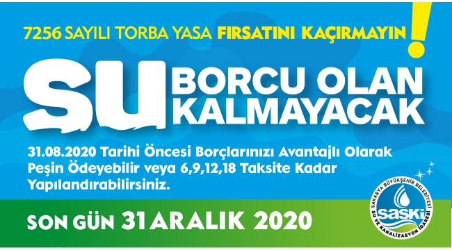 SASKİ, Torba Yasa olarak bilinen 7256 sayılı kanun ile su borcu olan vatandaşlara borçlarını yapılandırma fırsatı sunuyor. Yapılandırma sayesinde su borcu olan vatandaşlar avantajlı ödeme fırsatlarından 31 Aralık 2020 tarihine kadar yararlanabilecek.