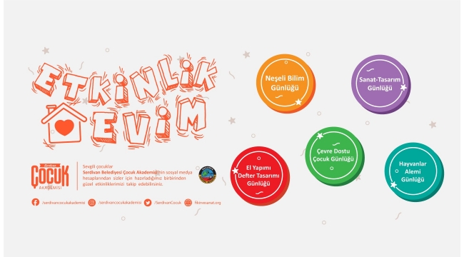 Koronavirüs sürecinde çocuklara yönelik etkinliklerini online olarak sürdüren serdivan Belediyesi Çocuk Akademisi, Etkinlik Evim başlığı altında birçok çalışmayı takipçilerine sunuyor. Neşeli Bilim Günlüğü, Çevre Dostu Çocuk Günlüğü, Sanat Tasarım Günlüğü, El Yapımı Defter Günlüğü ve Hayvanlar Alemi Günlüğü başlıklarıyla beş farklı etkinlik Akademi eğitmenlerinin anlatımıyla her gün Serdivan Çocuk Akademisi sosyal medya hesaplarından paylaşılıyor. Etkinlikleri Instagram, Facebook, Twitter ve Youtube’dan takip eden aileler ve çocuklar paylaşılan etkinlikleri evlerinde uygulama fırsatı da buluyor.