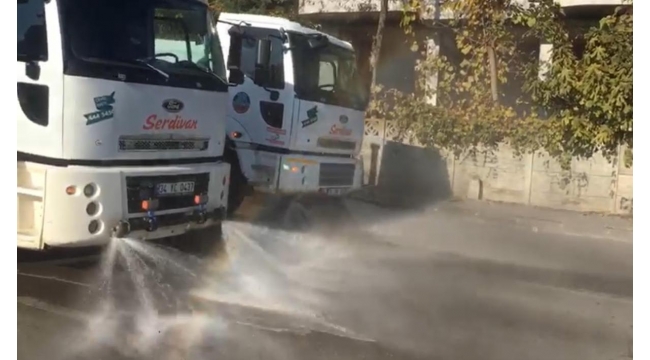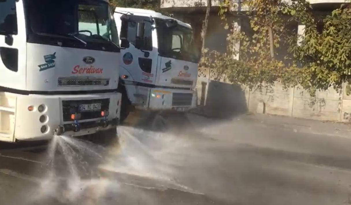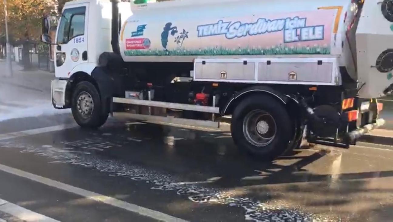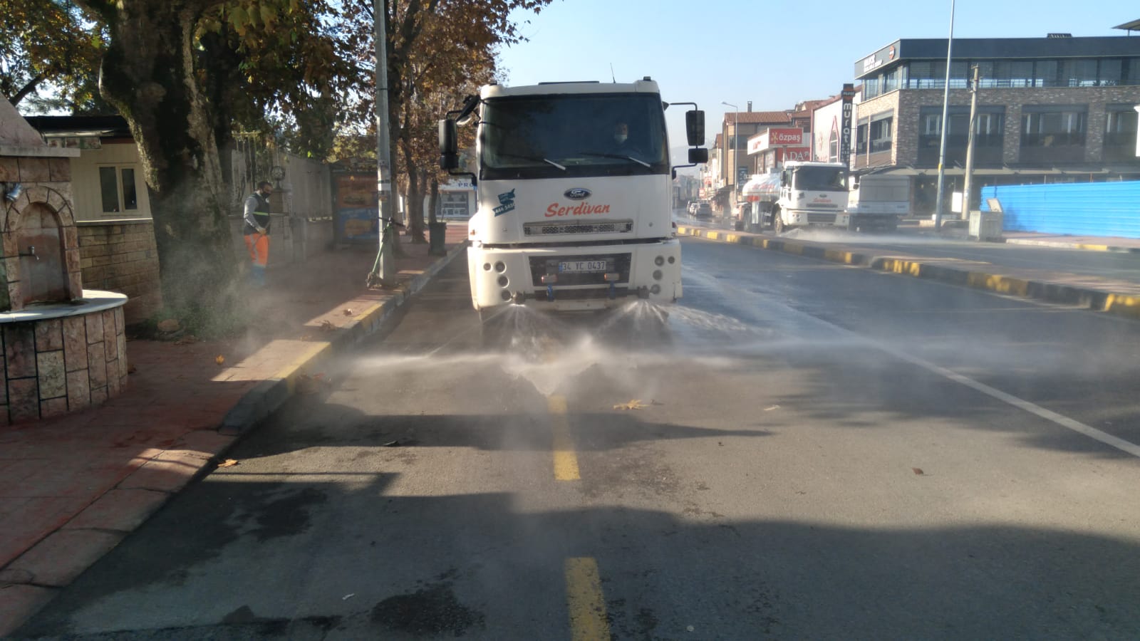 Serdivan Belediyesi iki günlük sokağa çıkma yasağında ilçe genelindeki cadde ve sokakları dezenfekte etti.