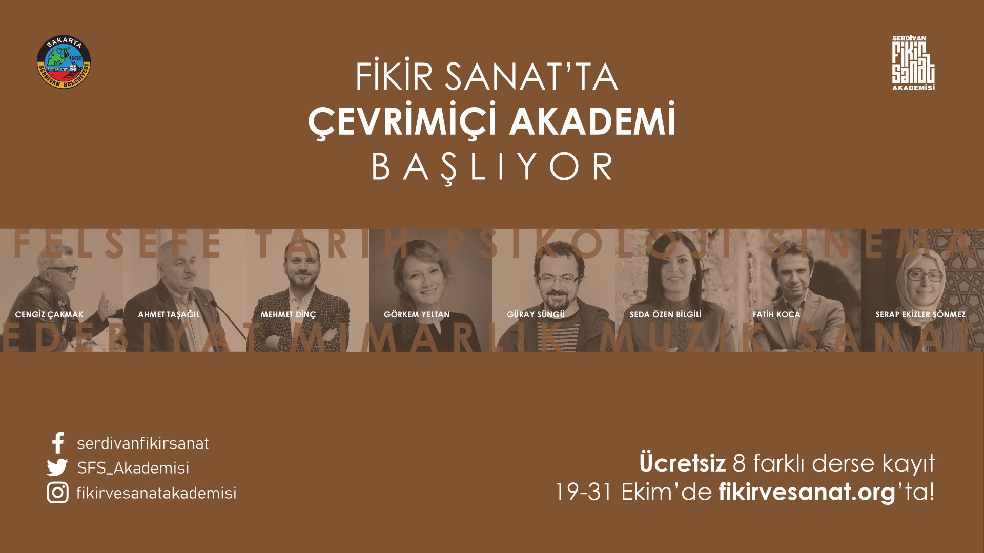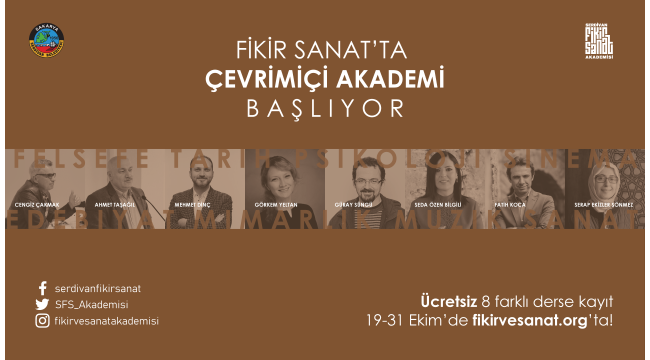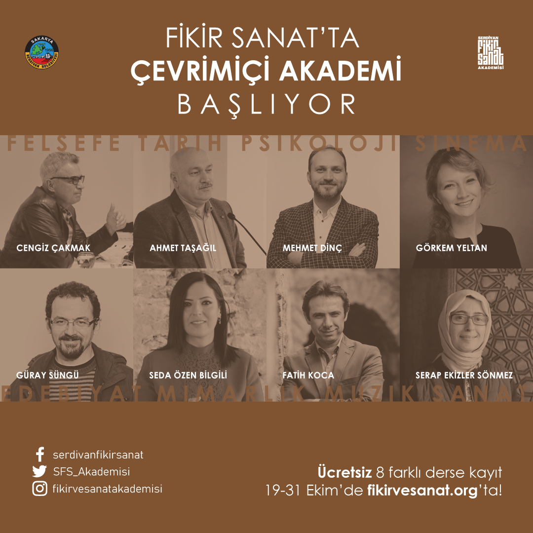 Mart ayında, Türkiye genelinde yüz yüze eğitimlere ara verilmesi ile birlikte, akademik programlarına kısa bir mola veren Serdivan Fikir ve Sanat Akademisi, alanlarında önemli isimleri güz dönemi derslerinde çevirim içi olarak öğrencilerle buluşturuyor. Felsefe, Tarih, Psikoloji, Sinema, Edebiyat, Mimarlık, Müzik, Sanat disiplinlerinin yer aldığı 8 farklı dersten oluşan güz dönemi programına dünyanın her yerinden çevrim içi katılmak mümkün olacak. Ders başvurularının online olarak alındığı programların içeriğine ise www.fikirvesanat.org adresinden ve Serdivan Fikir ve Sanat Akademisi’nin sosyal medya hesaplarından ulaşmak mümkün. Ücretsiz olarak erişilebilecek derslere son başvuru 31 Ekim Cumartesi.