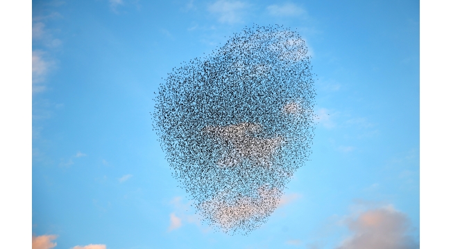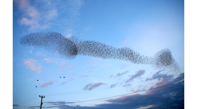 Farklı şekiller oluşturarak zaman zaman ayrılıp tekrar birleşen kuşların kent merkezinin farklı bölgelerine giderek dans edercesine uçması vatandaşlar tarafından ilgiyle izlendi.