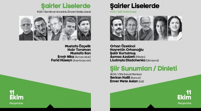Sakarya Büyükşehir Belediyesi 18. Uluslararası sapanca Şiir Akşamları, 11 Ekim Perşembe günü düzenlenecek etkinliklerle devam edecek. Saat 11.00’da gerçekleştirilecek etkinliklerde katılımcı şairler farklı okullarda öğrencilerle buluşacak. Saat 18.00’da Ofis Sanat Merkezi’nde şairlerin şiir sunumları gerçekleştirilecek. Ud’da Enver Mete Aslan, Kanun’da Serkan Halili katılımcılara müzik dinletisi sunacak. Liselerde ve OSM’de şiirŞairler Liselerde etkinliği iki farklı lisede saat 11.00’da başlayacak. Serdivan Anadolu İmam Hatip Lisesi’nde Mustafa Özçelik, Hıdır Toraman, Mustafa Sarı, Ermir Nika, Farid Hüseyn şiirsever gençlerle bir araya gelecek. SAÜ Vakfı Koleji’nde ise Orhan Özekinci, Hüseyin Orhanoğlu, Şakir Kurtulmuş, Asmaa Azaizeh, Liudmyla Diadchenko şiirlerini öğrenciler için okuyacak. Günün sonunda ise Ofis Sanat Merkezi’nde şiir sunumlarının yanı sıra Enver Mete Aslan ile Serkan Halili’nin Ud ve Keman dinletisi katılımcılarla buluşacak. Program saat 18.00’da başlayacak.