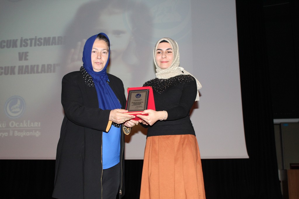 Programa katılımları ve sunumları nedeniyle Burcu Başak Kosovalı'ya plaketini mhp İl Kadın Kolları Başkanı Leyla Tankal takdim ederken, Gülnur Ayşe Er'e ise plaketini Ülkü Ocakları Başkanı soyhan sofuoğlu takdim etti.