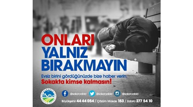 Sakarya Büyükşehir Belediyesi tarafından başlatılan ‘Sokakta Kimse Kalmasın’ projesi kapsamında çalışmalar devam ediyor. Büyükşehir Belediyesi tarafından yapılan açıklamada kar yağışı ve soğuk hava şartlarında kimsesiz ve sokakta yaşamak durumunda kalan vatandaşların Büyükşehir Belediyesi yetkililerine bildirilmesi konusunda hassasiyet çağrısında bulunuldu.