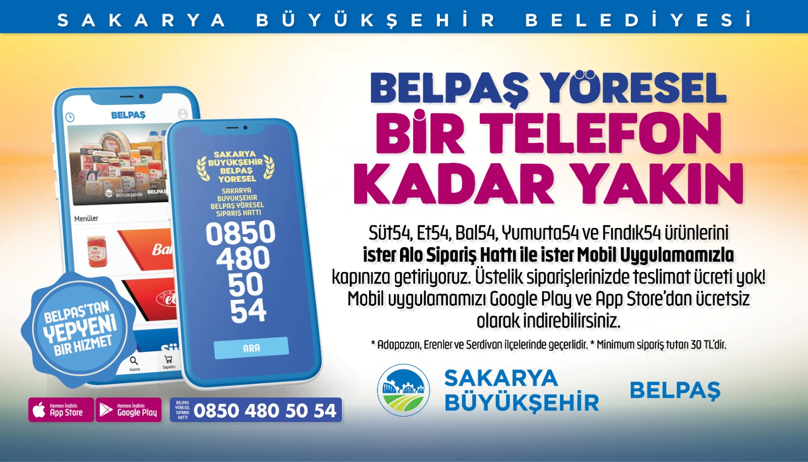 Büyükşehir Belediyesi iştiraklerinden BELPAŞ, İçişleri Bakanlığı’nın son yayınladığı genelgenin ardından paket servis uygulamasına geçti. Ayrıca Süt54, Yumurta54, Fındık54, Et54 ve Bal54 yöresel ürünleri de bir telefon uzaklıkta olacak.