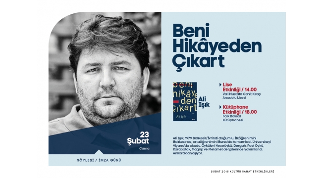 Sakarya Büyükşehir Belediyesi Şubat Kültür Sanat Etkinlikleri, 23 Şubat Cuma günü gerçekleştirilecek ‘Beni Hikâyeden Çıkart’ kitabının söyleşi ve imza günü programı ile devam edecek. yazar Ali Işık’ın kaleme aldığı ‘Beni Hikâyeden Çıkart’ isimli eser iki farklı yerde konuşulacak. İlk olarak saat 14.00’da Vali Mustafa Cahit Kıraç Anadolu Lisesi öğrencileriyle bir araya gelecek olan Işık, saat 18.00’da Faik Baysal Kütüphanesi’nde kültür sanat dostlarıyla buluşacak. Kültür ve Sosyal İşler Dairesi Başkanlığı’ndan yapılan açıklamada, “Yazar Işık’ın Beni Hikâyeden Çıkart isimli kitabının konuşulacağı söyleşi ve imza günü etkinliğimize tüm kültür sanat dostları davetlidir” denildi.
