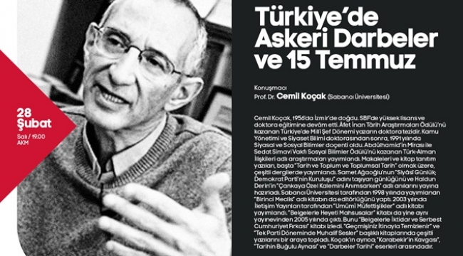 Sakarya büyükşehir belediyesi Kültür ve Sosyal İşler Dairesi Başkanlığı tarafından düzenlenen Şubat kültür sanat etkinlikleri ‘Türkiye’de Askeri Darbeler ve 15 Temmuz’ konulu konferans ile sona erecek. 28 Şubat Salı günü saat 19.00’da Adapazarı Kültür Merkezi’nde gerçekleştirilecek programa Prof. Dr. Cemil Koçak konuşmacı olarak katılacak. Büyükşehir Belediyesi’nden yapılan açıklamada, saat 19.00’da başlayacak programa tüm kültür sanat dostları davet edildi.