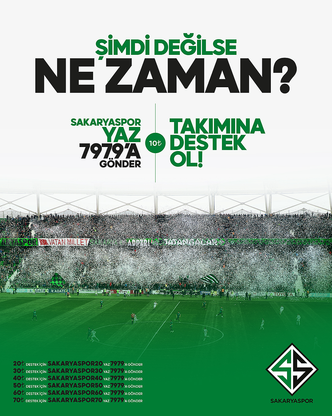 Başkan Zeki Toçoğlu, Sakaryaspor’un ‘Şimdi Değilse Ne Zaman’ sloganıyla başlatılan destek kampanyasına tüm yeşil siyah sevdalılarını davet etti. Toçoğlu, “Takımımıza destek için; cep telefonların Sakaryaspor yazarak 7979’a göndereceğimiz her mesaj takımımıza ekonomik olarak önemli bir katkı sağlayacak. Tüm taraftarlarımızı takımımıza destek olmaya davet ediyorum” dedi.