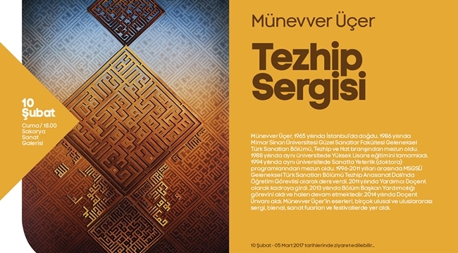 Büyükşehir Belediyesi Şubat Kültür Sanat Etkinlikleri kapsamında 10 Şubat Cuma günü saat 18.00’da Münevver Üçer’in eserlerinden oluşan Tezhip Sergisi Sakaryalı sanatseverlerin beğenisine sunulacak.