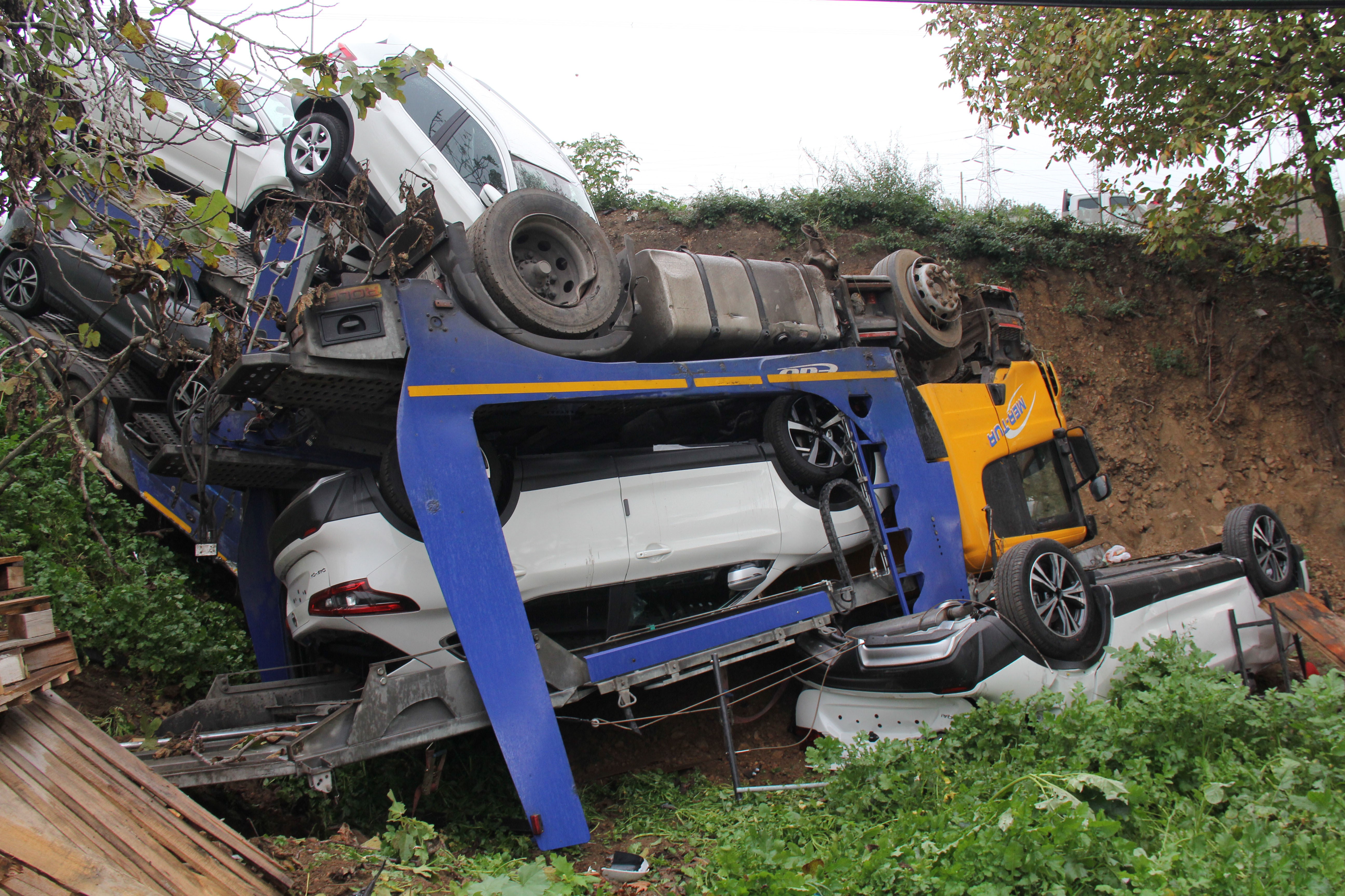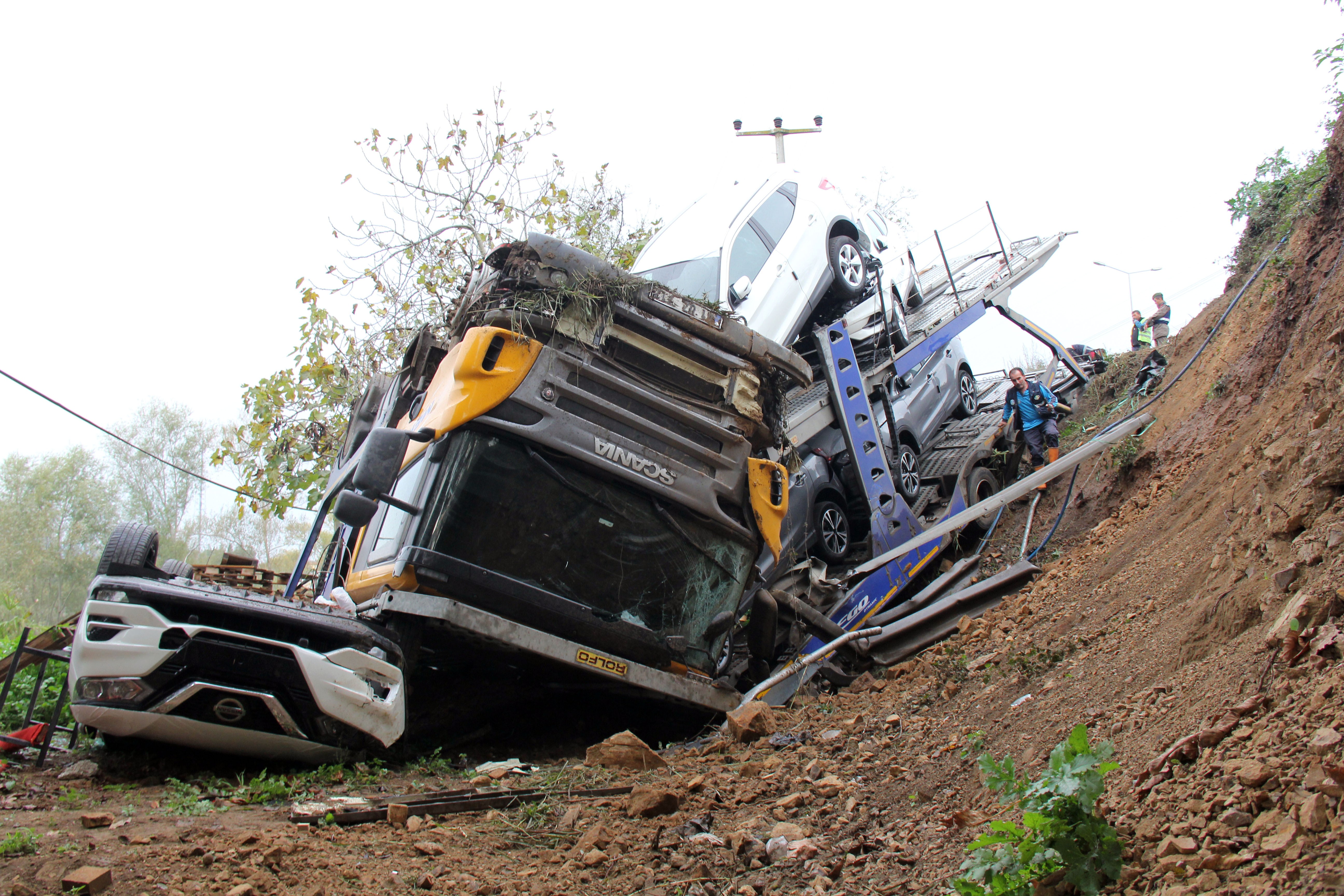 Kaza sabah saatlerinde Adapazarı-İzmit karayolu Serdivan Esentepe Mahallesi Aşağıdereköy mevkiinde meydana geldi. Edinilen bilgiye göre sıfır lüks cip yüklü Erdal Erbay(30) idaresindeki 41 UZ 712 plakalı tır, Aşağıdereköy mevkiinde kontrolden çıktı. Sürücünün hakimiyetini kaybettiği tır, yol kenarındaki bariyerleri parçalayarak, 15 metre yükseklikten Sapanca Gölü kenarındaki tarlaya uçtu. Kazada sürücü Erbay, araç içinde sıkıştı. Kaza sonrasında ters dönen tırdan tarlaya devrilen ve araç üzerindeki tanesi 165 bin TL olan lüks cipler ise hurdaya döndü.