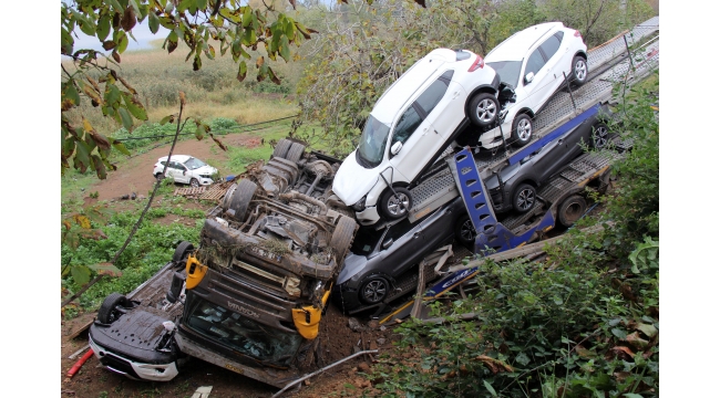 İzmit-Adapazarı yolu Serdivan ilçesi mevkiinde lüks sıfır ciplerin yüklü olduğu tırın yol kenarına devrilmesi sonucunda tırda yüklü araçlar hurdaya döndü.