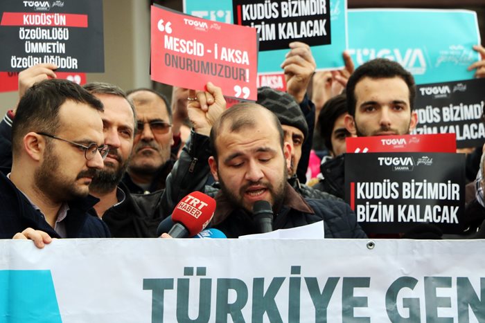 Orhan Cami önünde yapılan basın açıklamasını Türkiye Gençlik Vakfı Sakarya İl Temsilcisi Muhammet Fatih Yahşi okudu. Yahşi, "Her geçen gün İslam coğrafyası küresel sömürü düzeninin kıskacında kan gölüne çevrilmektedir. Dün kendini muasır medeniyetler seviyesinde gören Avrupa'nın merkezinde Bosna'da yaşanan soykırım hafızalarımızda taze iken; Arakan'da naklen soykırımlarda kimyasal silahlarla masum çocuklar ve kadınlar katledilirken, milyonlarca insan yerlerinden yurtlarından ayrılmak durumunda kalmıştır. Silahların menşei dünyanın kan emici vampirleri olan sömürgeci ülkeler arasında değişirken ölenlerin hep savunmasız Müslümanlar olduğu açık bir şekilde görülmektedir. Bir yandan gönül coğrafyamıza ölümler yağdırılırken; bir yandan da kutsallarımız çiğnenip topraklarımıza el uzatılmaktadır. Hadsizliğin, saldırganlığın ve hukuksuzluğun geldiği son nokta olarak siyonizmin bu devirdeki kullanışlı piyonu trump aracılığıyla ilk kıblemiz Kudüs'ümüzü işgalci İsrail'in Siyonist emelleri doğrultusunda başkent ilan etme cüretinde bulunmuşlardır" dedi.