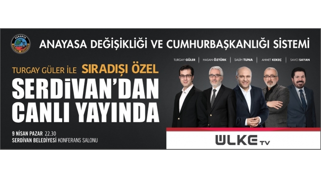 Anayasa Değişikliği Ve Cumhurbaşkanlığı Sistemi Konuşulacak 16 Nisan’daki referandum öncesi, “Anayasa Değişikliği ve Cumhurbaşkanlığı Sistemi” tüm yönleriyle bu programda konuşulacak.Serdivan Belediyesi Konferans Salonu’ndan canlı olarak yayınlanacak Sıradışı Özel programında, Güler'e; Savcı Sayan, Hasan Öztürk, Salih Tuna ve Ahmet Kekeç de eşlik edecek.