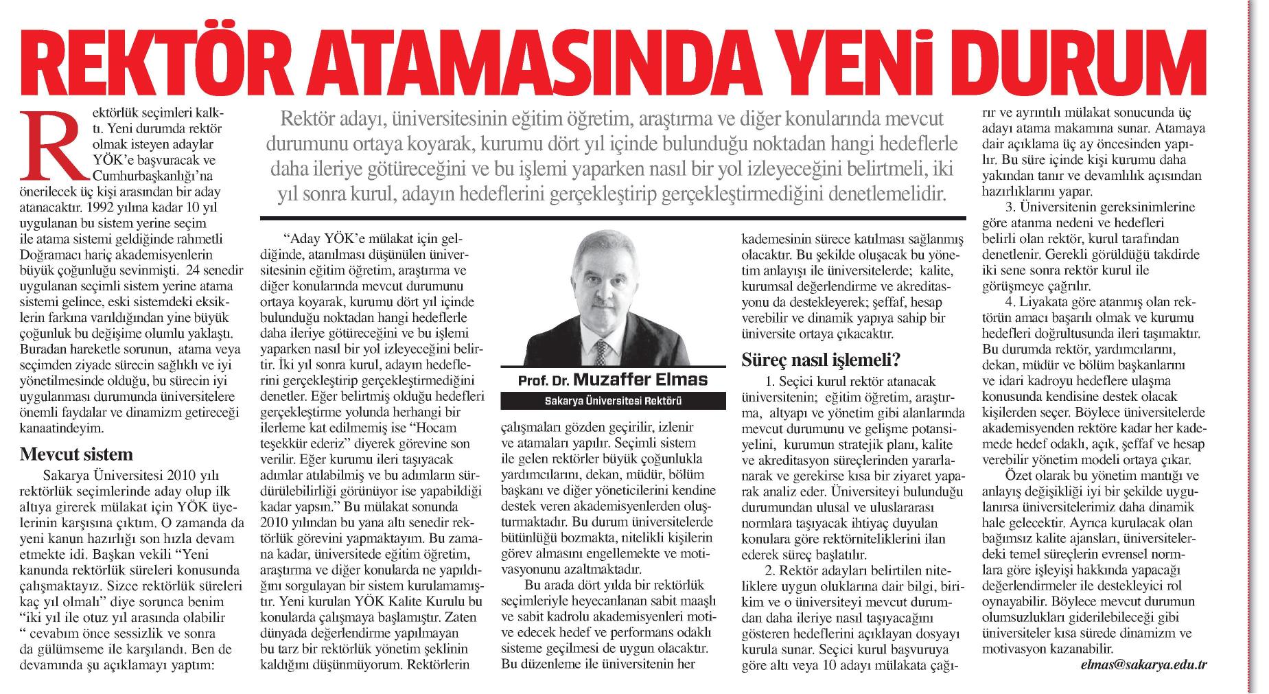 Rektör Prof. Dr. Elmas Star gazetesinde yayımlanan yazısında “24 senedir uygulanan seçimli sistem yerine atama sistemi gelince, eski sistemdeki eksiklerin farkına varıldığından yine büyük çoğunluk bu değişime olumlu yaklaştı. Buradan hareketle sorunun, atama veya seçimden ziyade sürecin sağlıklı ve iyi yönetilmesinde olduğu, bu sürecin iyi uygulanması durumunda üniversitelere önemli faydalar ve dinamizm getireceği kanaatindeyim” ifadelerine yer verdi. Yeni sistemin iyi bir şekilde uygulanması durumunda üniversitelerin daha dinamik hale geleceğine dikkat çeken Elmas “Ayrıca kurulacak olan bağımsız kalite ajansları, üniversitelerdeki temel süreçlerin evrensel normlara göre işleyişi hakkında yapacağı değerlendirmeler ile destekleyici rol oynayabilir. Böylece mevcut durumun olumsuzlukları giderilebileceği gibi üniversiteler kısa sürede dinamizm ve motivasyon kazanabilir” ifadelerini kullandı. Rektör Elmas’ın yazısı şöyle:Rektörlük seçimleri kalktı. Yeni durumda rektör olmak isteyen adaylar YÖK’e başvuracak ve Cumhurbaşkanlığı’na önerilecek üç kişi arasından bir aday atanacaktır. 1992 yılına kadar 10 yıl uygulanan bu sistem yerine seçim ile atama sistemi geldiğinde rahmetli Doğramacı hariç akademisyenlerin büyük çoğunluğu sevinmişti. 24 senedir uygulanan seçimli sistem yerine atama sistemi gelince, eski sistemdeki eksiklerin farkına varıldığından yine büyük çoğunluk bu değişime olumlu yaklaştı. Buradan hareketle sorunun, atama veya seçimden ziyade sürecin sağlıklı ve iyi yönetilmesinde olduğu, bu sürecin iyi uygulanması durumunda üniversitelere önemli faydalar ve dinamizm getireceği kanaatindeyim. Mevcut sistemSakarya Üniversitesi 2010 yılı rektörlük seçimlerinde aday olup ilk altıya girerek mülakat için YÖK üyelerinin karşısına çıktım. O zamanda da yeni kanun hazırlığı son hızla devam etmekte idi. Başkan vekili “Yeni kanunda rektörlük süreleri konusunda çalışmaktayız. Sizce rektörlük süreleri kaç yıl olmalı” diye sorunca benim “iki yıl ile otuz yıl arasında olabilir “ cevabım önce sessizlik ve sonra da gülümseme ile karşılandı. Ben de devamında şu açıklamayı yaptım: “Aday YÖK’e mülakat için geldiğinde, atanılması düşünülen üniversitesinin eğitim öğretim, araştırma ve diğer konularında mevcut durumunu ortaya koyarak, kurumu dört yıl içinde bulunduğu noktadan hangi hedeflerle daha ileriye götüreceğini ve bu işlemi yaparken nasıl bir yol izleyeceğini belirtir. İki yıl sonra kurul, adayın hedeflerini gerçekleştirip gerçekleştirmediğini denetler. Eğer belirtmiş olduğu hedefleri gerçekleştirme yolunda herhangi bir ilerleme kat edilmemiş ise “Hocam teşekkür ederiz” diyerek görevine son verilir. Eğer kurumu ileri taşıyacak adımlar atılabilmiş ve bu adımların sürdürülebilirliği görünüyor ise yapabildiği kadar yapsın.” Bu mülakat sonunda 2010 yılından bu yana altı senedir rektörlük görevini yapmaktayım. Bu zamana kadar, üniversitede eğitim öğretim, araştırma ve diğer konularda ne yapıldığını sorgulayan bir sistem kurulamamıştır. Yeni kurulan YÖK Kalite Kurulu bu konularda çalışmaya başlamıştır. Zaten dünyada değerlendirme yapılmayan bu tarz bir rektörlük yönetim şeklinin kaldığını düşünmüyorum. Rektörlerin çalışmaları gözden geçirilir, izlenir ve atamaları yapılır. Seçimli sistem ile gelen rektörler büyük çoğunlukla yardımcılarını, dekan, müdür, bölüm başkanı ve diğer yöneticilerini kendine destek veren akademisyenlerden oluşturmaktadır. Bu durum üniversitelerde bütünlüğü bozmakta, nitelikli kişilerin görev almasını engellemekte ve motivasyonunu azaltmaktadır. Bu arada dört yılda bir rektörlük seçimleriyle heyecanlanan sabit maaşlı ve sabit kadrolu akademisyenleri motive edecek hedef ve performans odaklı sisteme geçilmesi de uygun olacaktır. Bu düzenleme ile üniversitenin her kademesinin sürece katılması sağlanmış olacaktır. Bu şekilde oluşacak bu yönetim anlayışı ile üniversitelerde; kalite, kurumsal değerlendirme ve akreditasyonu da destekleyerek; şeffaf, hesap verebilir ve dinamik yapıya sahip bir üniversite ortaya çıkacaktır.Süreç nasıl işlemeli? 1. Seçici kurul rektör atanacak üniversitenin; eğitim öğretim, araştırma, altyapı ve yönetim gibi alanlarında mevcut durumunu ve gelişme potansiyelini, kurumun stratejik planı, kalite ve akreditasyon süreçlerinden yararlanarak ve gerekirse kısa bir ziyaret yaparak analiz eder. Üniversiteyi bulunduğu durumundan ulusal ve uluslararası normlara taşıyacak ihtiyaç duyulan konulara göre rektörniteliklerini ilan ederek süreç başlatılır.2. Rektör adayları belirtilen niteliklere uygun oluklarına dair bilgi, birikim ve o üniversiteyi mevcut durumdan daha ileriye nasıl taşıyacağını gösteren hedeflerini açıklayan dosyayı kurula sunar. Seçici kurul başvuruya göre altı veya 10 adayı mülakata çağırır ve ayrıntılı mülakat sonucunda üç adayı atama makamına sunar. Atamaya dair açıklama üç ay öncesinden yapılır. Bu süre içinde kişi kurumu daha yakından tanır ve devamlılık açısından hazırlıklarını yapar.3. Üniversitenin gereksinimlerine göre atanma nedeni ve hedefleri belirli olan rektör, kurul tarafından denetlenir. Gerekli görüldüğü takdirde iki sene sonra rektör kurul ile görüşmeye çağrılır.4. Liyakata göre atanmış olan rektörün amacı başarılı olmak ve kurumu hedefleri doğrultusunda ileri taşımaktır. Bu durumda rektör, yardımcılarını, dekan, müdür ve bölüm başkanlarını ve idari kadroyu hedeflere ulaşma konusunda kendisine destek olacak kişilerden seçer. Böylece üniversitelerde akademisyenden rektöre kadar her kademede hedef odaklı, açık, şeffaf ve hesap vere