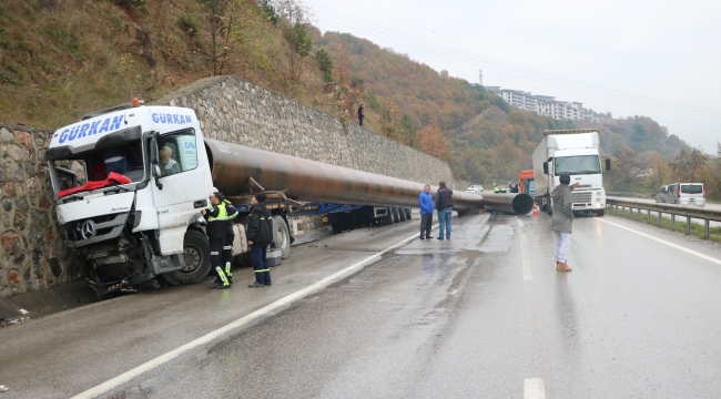 Serdivan ilçesinde sürücüsünün yağış nedeniyle direksiyon hakimiyetini kaybederek önce bariyerlere sonrasında ise yol kenarındaki duvara çarparak ancak durabilen, tırın dorse kısmında bulunan 25 ton ağırlığında ve 36 metre uzunluğundaki iki çelik boru yola savruldu. Kazada tır sürücüsü araç kabinine sıkıştı.