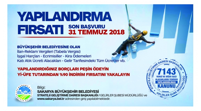 Sakarya Büyükşehir Belediyesi Gelirler Şube Müdürü Elife Bakırtaş, "7143 Sayılı vergi ve Diğer Bazı Alacakların Yeniden Yapılandırılmasına İlişkin Kanun"dan yararlanmak isteyen vatandaşlar için son başvuru tarihinin yaklaştığını hatırlattı. Bakırtaş, “Büyükşehir Belediyesi’ne olan birikmiş borçların ödenmesi noktasında başvuruda bulunmak isteyen vatandaşlarımız başvurularını 31 Temmuz Salı gününe kadar Büyükşehir Belediyesi Gelirler Şube Müdürlüğü'ne şahsen veya posta aracılığıyla yapabilecekleri gibi belediyemizin resmi sitesi üzerinden de gerçekleştirebilecekler” diye belirtti. Geniş kapsamlı yapılandırmaGelirler Şube Müdürü Elife Bakırtaş, “Resmi Gazete’de yürürlüğe giren 7143 Sayılı Vergi ve Diğer Bazı Alacakların Yeniden Yapılandırılmasına ilişkin kanun ile vatandaşlarımızın Büyükşehir Belediyesine olan borç ödemelerine taksitlendirme imkanı sunulmuştu. İdari para cezalarının haricindeki tüm borçları kapsayan kanun düzenlemesinden faydalanmak isteyen vatandaşlarımız www.sakarya.bel.tr adresinden geçmiş borç bilgilerine ulaşabilecek. Vatandaşlarımız yapılandırmanın ilk taksitini ise 30 Eylül 2018 tarihi Pazar gününe rastladığından 1 Ekim Pazartesi gününde ödeyecek. 6-9-12-18 aylık taksit imkanlarımız mevcut. Pek çok avantajı içinde barındıran düzenlemede ödeme kolaylığı sağlanması amacıyla taksitler ikişer aylık ödemeler halinde alınacak peşin ödemede bulunmak isteyen vatandaşlarımızın Yİ-ÜFE oranında ayrıca yüzde 90 indirim sağlanacak. Kapsamlı ve oldukça avantajlı düzenlemeden faydalanmak isteyen tüm vatandaşlarımızı 31 Temmuz Salı gününe kadar Gelirler Şube Müdürlüğü'ne başvurmaya davet ediyorum” dedi.