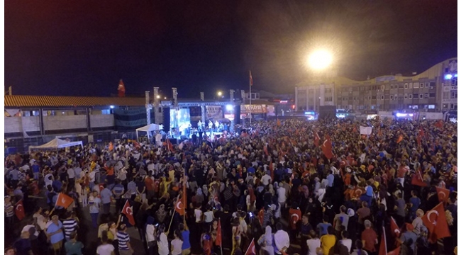 Sakarya, 15 Temmuz darbe girişimin ardından demokrasi nöbetine devam ediyor. Bu kapsamda kalkışmanın 15’inci gününde de Demokrasi Meydanı’ndaki toplanan on binlerce vatandaş darbeye karşı sloganlar attı. Milli irade ve seçilmiş hükümete karşı yapılan hain saldırı meydanda toplanan on binler tarafından lanetlendi. Programda Başkan Toçoğlu’nun yanı sıra, AK Parti İl Başkanı Fevzi Kılıç, belediye başkanları, ilçe başkanları, STK temsilcileri ve gazeteciler de yer aldı. 7’den 70’e Herkes MeydandaBaşkan Zeki Toçoğlu, “15 gündür şanlı direnişimizi metanetle sürdürüyoruz. Görüyoruz ki olaylar açığa çıktığı zaman nasıl bir tehlikeyle karşı karşıya olduğumuzu anlıyoruz. Maalesef Türk askerinin şanlı üniformasını sırtına geçiren alçak teröristler yapmayacaklarını bırakmadılar. Hamdolsun 15 Temmuz gecesi başlatılan bu direniş bu alçakların, hainlerin emellerine ulaşmalarını engellemiştir. Hepinizden Allah razı olsun. Böyle bir direnç tarihte az görülmüştür. 7’den 70’e herkes 15 gündür bu meydanda direnmeye devam ediyor. Cumhurbaşkanımızdan ikinci bir talimat gelene kadar da direnmeye devam edeceğiz” şeklinde konuştu Yanlarına Kar KalmayacakBaşkan Toçoğlu, “Arkadaşlar gerçekten örnek bir mücadele örneği gösteriyoruz. Bir mücadelenin nasıl İslami, insani vu hukuka uygun olduğunu tüm dünyaya gösteriyoruz. Yani hemen yanıbaşımızdaki alanda bulunan çiçekler dahi yerinde duruyor. Böyle bir direniş dünyanın neresinde var? Türkiye’de 76 milyon insan ayakta tek bir çıt yok. Çünkü biz hukuka ve değerlerimize bağlı insanlarız. Haklı bir mücadelemiz için meydanlardayız. Çok güzel şeyler olacak. İnşallah kimsenin yaptığı yanına kalmayacaktır” ifadelerini kullandı. Mazlum Coğrafyalarda EtkilenecekAK Parti İl Başkanı Fevzi Kılıç, “15 gecedir bu meydanlardasınız. Bugün darbelerin kitabı yazılsa 15 Temmuz darbe girişimi en alçağı olurdu. Sizler çok büyük bir kahramanlık örneği gösterdiniz. Bu ülkeye zarar gelirse, mazlum coğrafyalar da bundan etkilenecek. Hepimiz bunun bilincindeyiz. İnşallah Cumhurbaşkanımız ‘Evlere dönebilirsiniz’ diyene kadar da bu meydanlarda olacağız. Allah sizlerden razı olsun. Allah’a emanet olun” şeklinde konuştu. Karasu Meydan DolduKarasu Belediye Başkanı Mehmet İspiroğlu, “15 Temmuz’dan itibaren evini, aşını, işini ve çocuğunu ihmal ederek bu meydanları dolduran Sakaryalılar size sonsuz teşekkürlerimi sunuyorum. 15 Temmuz akşamı Büyükşehir Belediye Başkanımız Zeki Toçoğlu’nu aradım. Bana ‘Sen hala sokağa çıkmadın mı?’ diye sorunca inanın kendimden utandım. Ardından hemen belediyemizin tüm kapılarını açarak anonslar yaptık. Kısa süre içerisinde on binler Karasu Meydanı’nı doldurdu” diye konuştu. İman Dolu Göğüslerle15 Temmuz gecesi Valilikte askerlerin kurşununa hedef olan Gazi Mehmet Akyazıcı ise; “Ecdadımızın torunları olarak topla, tüfekle üzerimize geldiler. İman dolu göğüslerle onları bozguna uğrattık. Allah’a hamdolsun Rabbim bize zafer nasip etti. Samimiyetsiz, insanların dini duygularını kullanarak 40 yıllık sürede devletin her kademesini ele geçirdiler. En sonunda kendi insanlarına da kurşun sıkmayı göze alarak topla, tüfekle bize saldırdılar. 15 Temmuz gecesi de Allah bizlere gazilik nasip etti. Bu sürede yanımda olan herkesten Allah razı olsun. Rabbim bizi bu hainlere karşı bizi her zaman muzaffer eylesin” dedi.