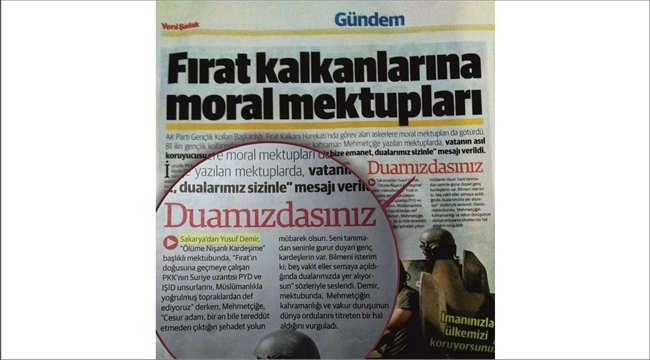 Yusuf Demir’in Mehmetçiğe Mektubu Yeni Şafak’ta…AK Parti Sakarya İl Gençlik Kolları Başkanı Yusuf Demir tarafından kaleme alınan “Ölüme Nişanlı Kardeşime” başlıklı duygu yüklü mektup da Yeni Şafak Gazetesi’nde yayınlandı. Sakarya Gençlik Kolları Başkanı Demir tarafından Fırat Kalkanı operasyonunda görevli Mehmetçiğimize ulaştırılmak üzere kaleme alınan mektubun tam metni ise şöyle:
