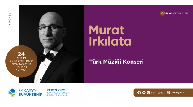 Sakarya Büyükşehir Belediyesi Şubat kültür sanat Etkinlikleri Murat Irkılata’nın Türk Müziği Konseri ile devam edecek. Müzikseverler ile buluşacak olan Ses Sanatçısı Murat Irkılata, Türk Müziğinden oluşan eserleri dinleyicilerin beğenisine sunacak. Kültür ve Sosyal İşler Dairesi Başkanlığı’ndan yapılan açıklamada 24 Şubat Pazartesi günü Ziya Taşkent Konser Salonu’nda 19.00’da başlayacak olan müzik programına tüm sanatseverlerin davetli olduğu ve biletlerin Kültür ve Sosyal İşler Dairesi Başkanlığı ile kurumsal internet sayfası sakarya.bel.tr üzerinden temin edilebileceği ifade edildi.